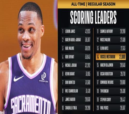 北京時間2月10日,國王后衛(wèi)拉塞爾-威斯布魯克達(dá)成了27000分里程碑,37歲的威少在歷史得分榜上排在第14位,他距離第13的埃爾文-海耶斯只差313分,國王這支擺爛的球隊剩下的唯一亮點就是威少,此役后國王已經(jīng)吞下13連敗。