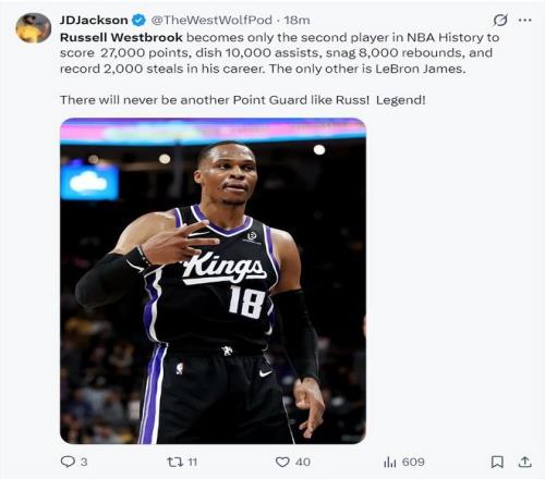 27000分里程碑!威少1點比肩詹皇成歷史唯二美媒高呼傳奇巨星