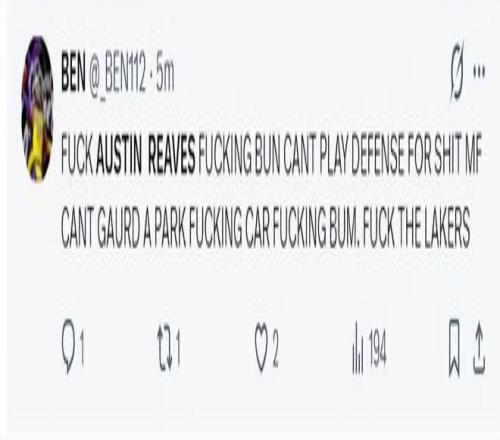 賽后湖人球迷也炮轟里夫斯:去XX的里夫斯,他根本不會(huì)防守,他在場(chǎng)上任何一個(gè)人他都防不住,F(xiàn)uX混蛋,去XX的湖人隊(duì)。