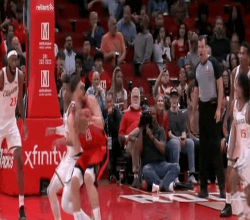——火箭謝潑德阿門申京單側(cè)三人轉(zhuǎn),嚇得快船傾斜一側(cè),電風扇空位遠射。這是攻。
