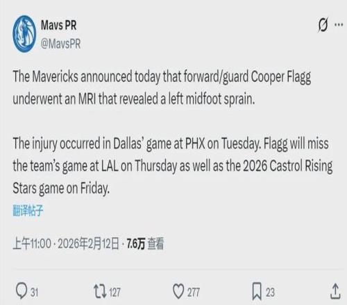北京時間2月12日中午,達拉斯獨行俠官方宣布:庫珀-弗拉格接受了核磁共振檢查,結(jié)果顯示左腳中部扭傷。弗拉格將缺席明天獨行俠和湖人的常規(guī)賽,同時退出2月14日開打的NBA新秀賽。這對NBA聯(lián)盟來說,無疑是重大打擊。