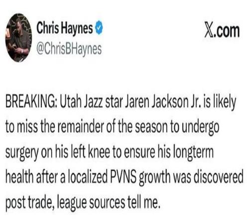 北京時間2月13日,當全明星球員賈倫-杰克遜被交易到爵士,僅出場3場比賽后,爵士官宣賈倫-杰克遜將因為膝傷接受膝蓋手術(shù),從而提前賽季報銷。