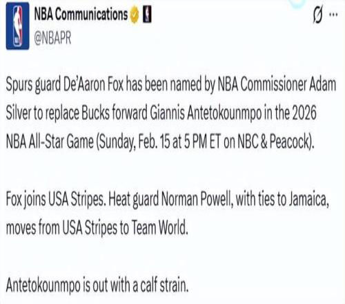 雄鹿官宣字母哥缺戰(zhàn)全明星賽!福克斯頂替入選鮑威爾調(diào)至世界隊(duì)