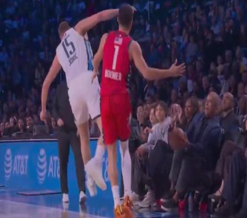 前美國總統(tǒng)奧巴馬也現(xiàn)身比賽現(xiàn)場觀戰(zhàn),并且在比賽中,約基奇和布克爭搶球權(quán)時把球傳給了奧巴馬。