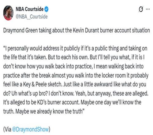 全明星周末期間,傳出了杜蘭特疑似使用小號的消息。這個小號賬號名叫g(shù)ethigher77。這個賬號里說過一些話,比如:“你們的當(dāng)家球星既不會投籃也不會防守,這問題比我的失誤嚴(yán)重多了。” 說的應(yīng)該是申京。還有“小賈巴里-史密斯根本信不過,投不進(jìn)、防不住,這人有點不行?!边@個賬號發(fā)表了很多類似言論,對杜蘭特的形象和外界評價都挺不利的。