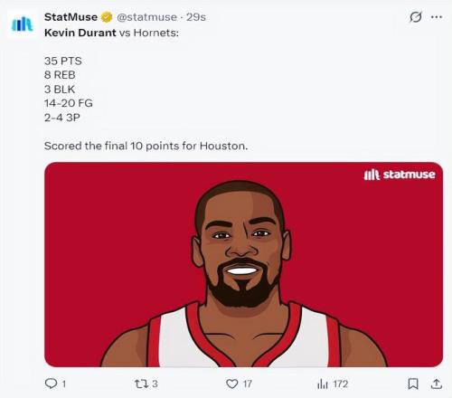 北京時(shí)間2月20日,37歲的凱文-杜蘭特再度上演了死神降臨,他在全明星周末受到居心不良之人的輿論侵?jǐn)_后依舊帶領(lǐng)一眾年輕人們復(fù)仇了黃蜂隊(duì),杜蘭特就是此役贏球的唯一功臣,他全場(chǎng)比賽斬獲35分8籃板4助攻,決勝時(shí)刻火箭全看他一人。