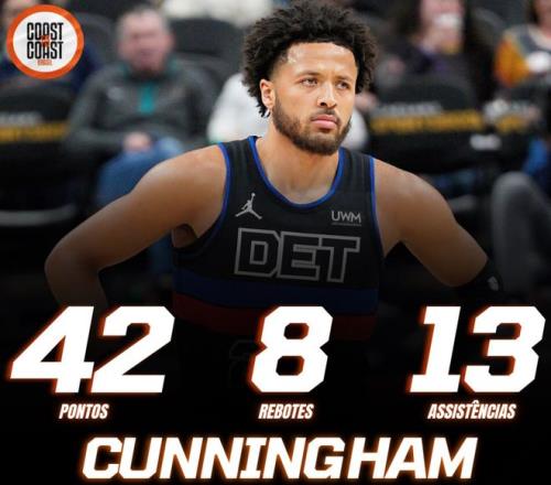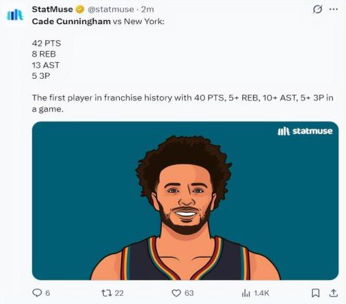 此役后坎寧安一戰(zhàn)創(chuàng)造多項(xiàng)紀(jì)錄:1.他成為活塞隊(duì)史85年首位單場(chǎng)40+10+5+5三分的球員;