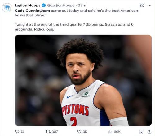 坎寧安三節(jié)打完已經(jīng)35+9+6,美媒LH寫(xiě)道:坎寧安今天剛剛站出來(lái)說(shuō)自己是美國(guó)最強(qiáng)的球員就打出這樣的表現(xiàn)。