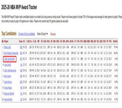 坎寧安目前的MVP概率只有1.9%排在第三,約基奇77.4%第一,亞歷山大16.6%第二。