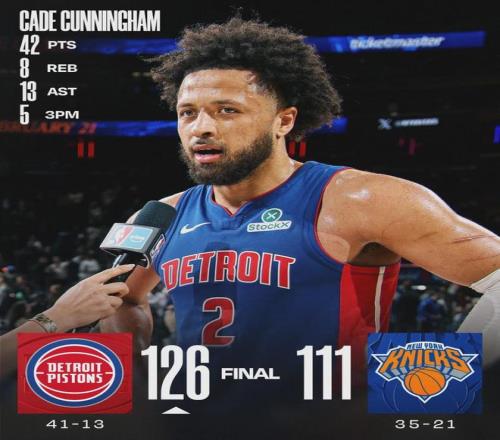活塞狀元坎寧安今天開(kāi)啟暴走模式:首發(fā)出戰(zhàn)38分鐘,34投17中,三分11中5,罰球3中3,狂轟42分8籃板13助攻1搶斷2蓋帽。他成為NBA歷史上第三個(gè)在麥迪遜廣場(chǎng)花園轟下40分+10助攻的客隊(duì)球員,前兩個(gè)是艾弗森和詹姆斯。