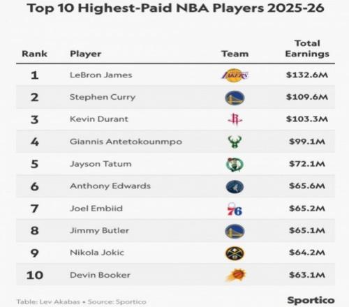 北京時(shí)間2月21日,美媒Sportico公布2025-26賽季NBA總收入(NBA年薪+場(chǎng)外代言收入)最高前十球員榜單,詹姆斯以1.326億美元高居榜首,庫(kù)里與杜蘭特分列二三位,他們也是僅有的3位超過(guò)1億美元收入球員。