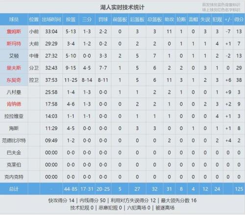 全場結(jié)束,湖人125-122險勝快船。東契奇38分6板11助3斷、里夫斯29分6板2助2斷,詹姆斯和艾頓各得13分。倫納德31分4板5助、馬瑟林26分7板2助。泰倫盧賽后不滿判罰:“湖人球員很優(yōu)秀了,還要騙犯規(guī)!這種吹罰真的很難!”