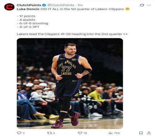 東契奇打快船是真的太猛了,4個三分球一個比一個難,一個比一個遠,首節(jié)8中6,三分5中4,拿到17分4助攻2籃板,東契奇無愧聯(lián)盟首節(jié)得分王。