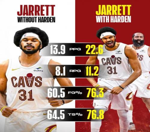 今年賽季中期的交易,哈登和加蘭互換東家,哈登加盟騎士,騎士補齊了最后一塊沖冠短板:進攻發(fā)動機。哈登作為歷史最強(或許沒有之一)雙能衛(wèi),雖然已經(jīng)36歲了,但是老A8還是A8,能力太強了。在快船的前半個賽季,場均25.8分5.2籃板8.2助攻,已經(jīng)是準全明星級別了,加盟騎士后,他繼續(xù)放權(quán),專心梳理進攻,場均18.4分4.8籃板8.6助攻1搶斷,投籃命中率49.1%,三分命中率48.1%,罰球命中率89.3%,而且球隊5勝0負,無死角的強?。?/p>