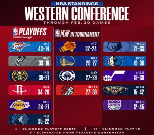 北京時間2月21日的常規(guī)賽打完后,西部的格局又發(fā)生了一些變化,雷霆大勝籃網(wǎng)但還是丟掉了聯(lián)盟第一,因為勝率已經(jīng)不如活塞;快船逆轉(zhuǎn)湖人失敗但開拓者慘敗掘金,快船還是穩(wěn)住了西部第九的席位。湖人與森林狼沒有勝場差,湖人是艱難壓制森林狼。