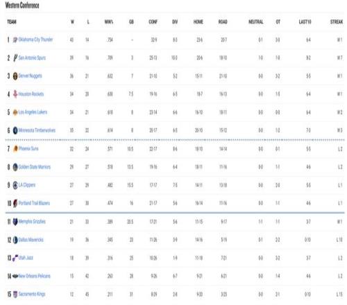 西部排名:雷霆、馬刺、掘金、火箭、湖人、森林狼、太陽、勇士、快船、開拓者、灰熊、獨行俠、爵士、鵜鶘、國王。