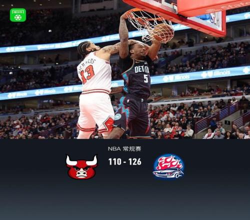 第四節(jié)公牛亞布塞萊拿下10分,活塞鄧肯-羅賓遜拿下9分,最終公牛110-126不敵活塞