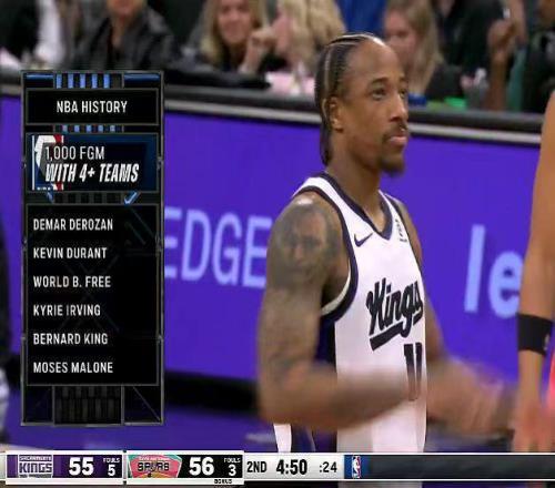 德羅贊在4支球隊(duì)達(dá)成命中1000記運(yùn)動戰(zhàn)進(jìn)球里程碑,成為NBA歷史第6人,前5人分別是杜蘭特、弗里、歐文、伯納德-金與摩西-馬龍。
