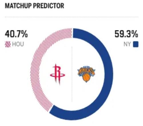 賽前,美媒ESPN對(duì)本場(chǎng)比賽進(jìn)行了勝率預(yù)測(cè),火箭隊(duì)勝率僅有40.7% ,而尼克斯勝率則為59.3% ,稍占優(yōu)勢(shì) 。
