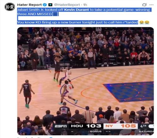 如果沒有看比賽,大家會認為小賈巴里-史密斯、凱文-杜蘭特兩人在關(guān)鍵時刻一人投丟了一個關(guān)鍵球,但看了比賽的球迷就知道杜蘭特決勝時刻的表現(xiàn)堪稱戰(zhàn)犯。