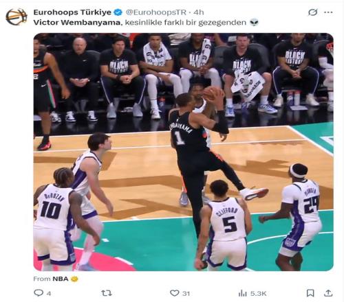 此役文班亞馬海在主場完成了一次持球突破的拉桿掄臂暴扣,裸足2.24米的文班亞馬還能完成如此炸裂的動(dòng)作讓不少球迷覺得比全明星扣籃大賽還要有趣。
