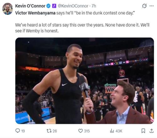 賽后文班亞馬談到自己的掄臂大風(fēng)車,他表示自己未來有朝一日肯定會(huì)參與全明星扣籃大賽。