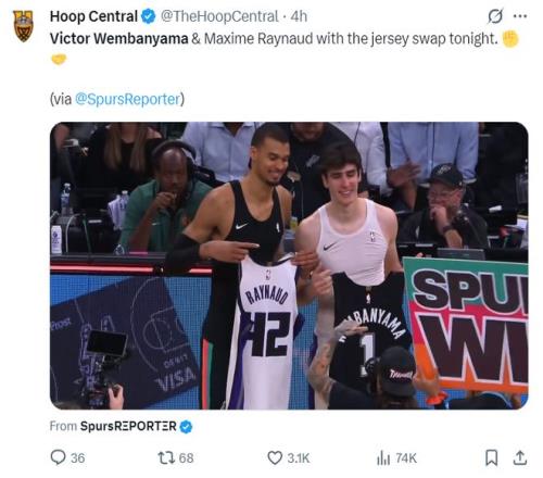 賽后文班亞馬與自己法國國青隊(duì)友雷諾互換了球衣。此役文班亞馬29分45秒,20中11,三分5中1,罰球7中5拿到28分15籃板6助攻1搶斷4蓋帽,命中率55%。雷諾則拿到16分12籃板1蓋帽。此役后文班亞馬生涯第545次蓋帽已經(jīng)升至馬刺隊(duì)史第五。