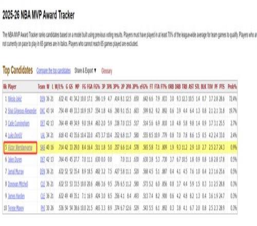 文班亞馬更強(qiáng)悍的地方在于,馬刺隊(duì)是西部第二的豪強(qiáng),這讓文班亞馬的MVP概率排在聯(lián)盟第五,僅次于約基奇、亞歷山大、坎寧安、東契奇。從這個(gè)角度來看文班亞馬入選最佳一陣幾乎是板上釘釘,只要文班亞馬出戰(zhàn)超過65場應(yīng)該就是最佳陣容。