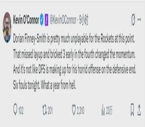 誰是火箭本賽季最失敗的引援?毫無疑問,芬尼-史密斯!NBA名記Kevin O'Connor寫道:“芬尼-史密斯在火箭的表現(xiàn)已經(jīng)到了幾乎無法上場的地步。他在防守端的作用,也不能彌補他糟糕至極的進攻表現(xiàn),真是噩夢一般的賽季!”