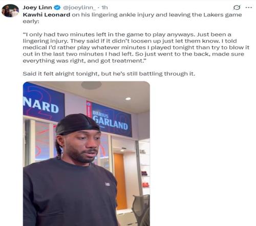 賽后倫納德談到了自己的腳踝傷病與登場時間限制的話題,他表示:因?yàn)槲乙恢庇袀谏恚杂行┍荣愑械菆鰰r間限制,我跟醫(yī)療團(tuán)隊說這場比賽能打多少分鐘就打多少分鐘,對陣湖人最后幾分鐘我經(jīng)過檢查后被強(qiáng)制留在替補(bǔ)席,今晚我的感覺還不錯。