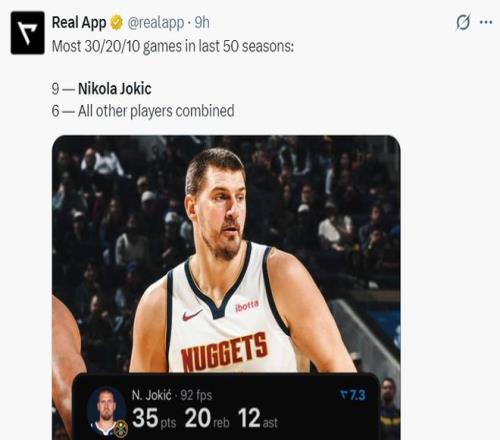 7.過(guò)去50個(gè)賽季約基奇9次30+20+10,其余人6次;