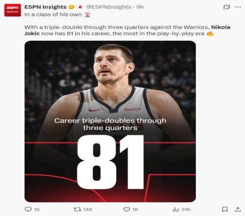 此役后約基奇再度創(chuàng)造多項(xiàng)紀(jì)錄:1.生涯第81次前三節(jié)三雙歷史第一;