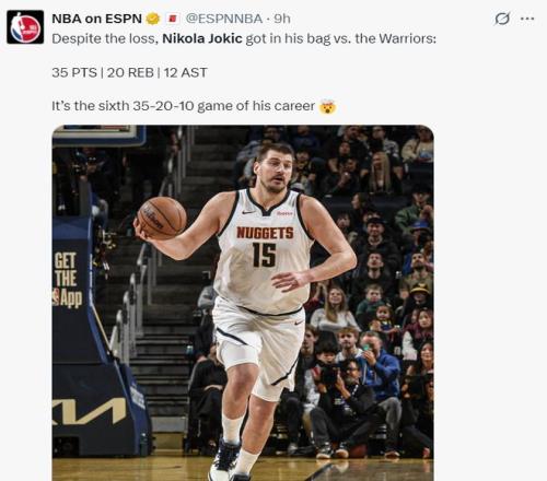 3.約基奇生涯第六次單場(chǎng)35+20+10;