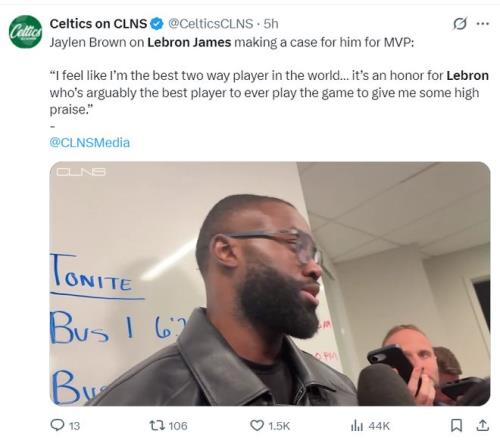 賽后杰倫-布朗回應詹姆斯說自己應該進入MVP討論的話題,布朗說道:聽到詹姆斯說我應該進入MVP討論這是一種榮耀,勒布朗可以說是NBA歷史最出色的球員,這是很高的贊美,我每天醒來都會心存感激。