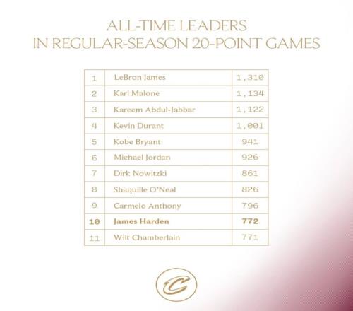 這場比賽哈登迎來里程碑,他完成772次20+升至歷史第10,排在他身前的安東尼是796場。