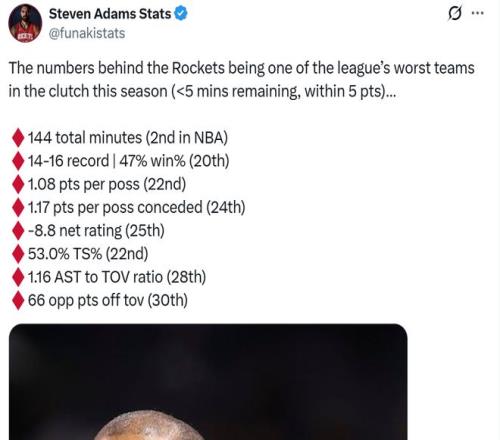 并且火箭隊(duì)關(guān)鍵時(shí)刻各項(xiàng)數(shù)據(jù)均排在聯(lián)盟墊底行列,開賽至今當(dāng)比賽進(jìn)入關(guān)鍵時(shí)刻時(shí)(最后5分鐘,分差5分以內(nèi)),火箭隊(duì)?wèi)?zhàn)績(jī)僅為14勝16負(fù)聯(lián)盟第20。