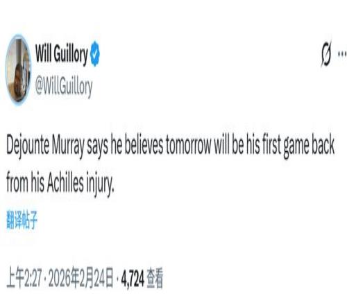 鵜鶘后衛(wèi)穆雷自2025年2月1日右腳跟腱撕裂后一直缺陣至今,如今他即將復(fù)出。另一位記者羅德-沃克消息,這位前全明星球員已在上周四、周五參加了完整訓(xùn)練。