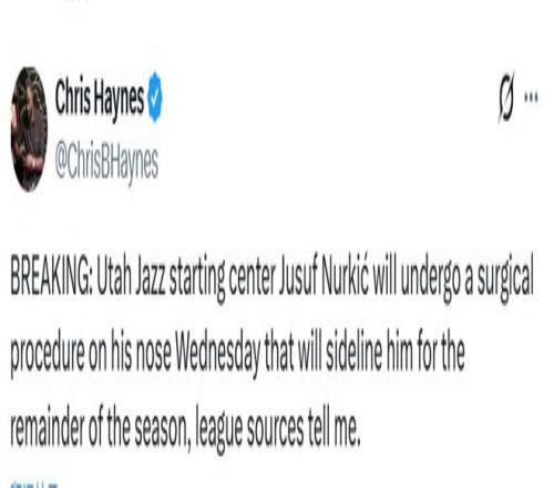 北京時(shí)間2月24日,據(jù)名記Haynes報(bào)道,猶他爵士隊(duì)中鋒努爾基奇將于明日接受鼻子手術(shù),賽季報(bào)銷。努爾基奇幾年前鼻子骨折后,一直飽受呼吸和睡眠問題的困擾。