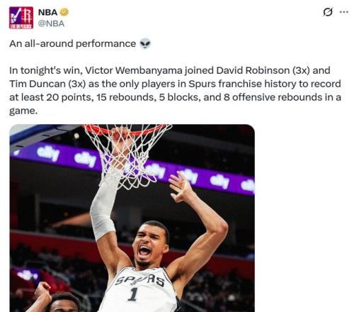 憑借這樣的表現(xiàn),文班成為馬刺隊史第三位單場至少拿下20分15板8前場板5帽的球員,前兩人是大衛(wèi)羅賓遜與鄧肯。