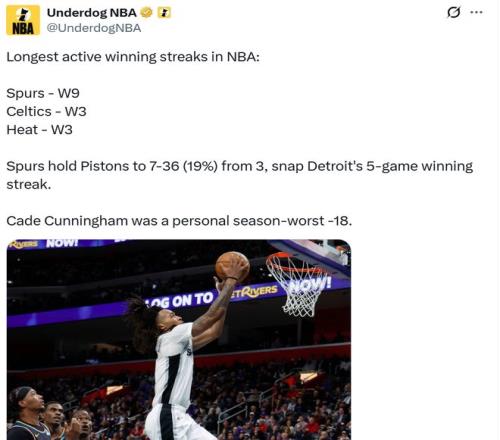 馬刺隊9連勝不僅是聯(lián)盟現(xiàn)存最長連勝,也是馬刺隊時隔7年再次拿到9連勝,上次要追溯到18-19賽季,本賽季也是馬刺自18-19賽季后再次拿到至少41場勝利。