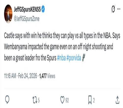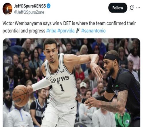 文班則認(rèn)為本場擊敗聯(lián)盟第一活塞是團(tuán)隊的勝利,每個人都在這場比賽中有所貢獻(xiàn),同時本場勝利是馬刺證明自身實力和取得進(jìn)步的重要時刻。