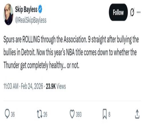 名嘴Skip則表示馬刺隊勢如破竹,不僅拿下9連勝,還擊敗了聯(lián)盟第一活塞,現(xiàn)在壓力給到雷霆隊,能否保持健康將決定本賽季NBA冠軍的歸屬。