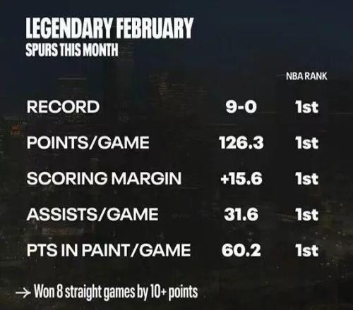 馬刺當(dāng)前勢(shì)頭極佳,今年二月份至今未嘗敗績,9勝0負(fù),并且場均得分(126.3)、場均凈勝分(15.6)、場均助攻數(shù)(31.6)、場均禁區(qū)得分(60.2)均高居聯(lián)盟榜首,對(duì)于他們而言一切皆有可能。