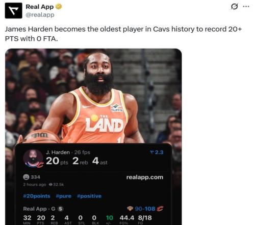 憑借這樣的表現(xiàn),36歲零183天的哈登成為騎士隊史上單場0罰球情況下砍下20+最老的球員。