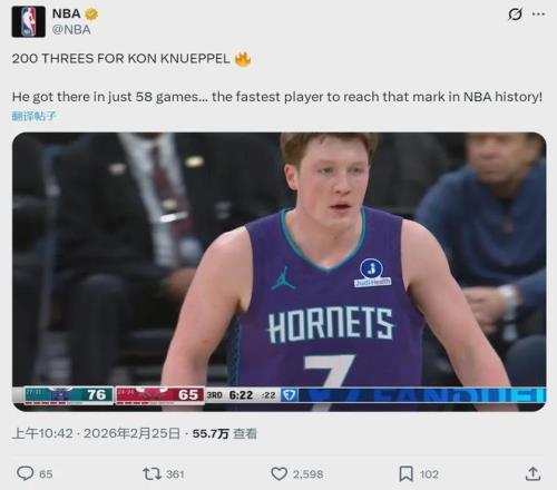 歷史第三快是基根-穆雷的77場(chǎng),第四是布蘭登-米勒的79場(chǎng),第五是杰倫-格林的82場(chǎng)。庫里和克萊都是用了99場(chǎng)比賽,才投進(jìn)生涯第200記三分。NBA新秀單賽季三分命中數(shù)是206記,由基根-穆雷創(chuàng)造,克尼佩爾只差6球就能超越!