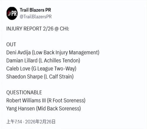 北京時間2月26日,開拓者已經(jīng)召回楊瀚森,并更新了他的傷情。明日出戰(zhàn)公牛的狀態(tài)是出戰(zhàn)成疑(50%上場可能),他的傷病被標(biāo)注為背部中段酸痛。此前,前方消息是他遭遇了背部拉傷。此外,羅威因右腳酸痛也被列為出戰(zhàn)成疑,阿夫迪亞、利拉德、樂福和夏普被列為缺陣狀態(tài)。
