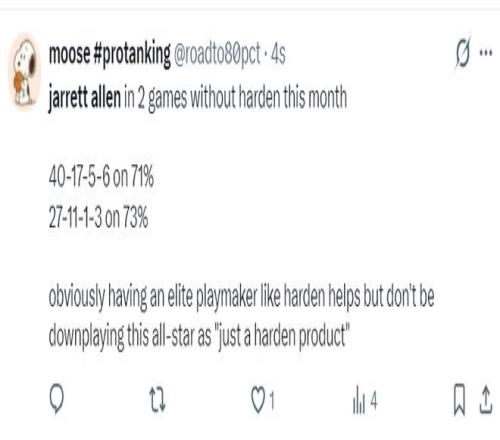 有數(shù)據(jù)媒體寫道,二月份阿倫在沒有哈登的情況下打了兩場比賽,一場40分17籃板5助攻2搶斷4蓋帽,真實命中率71%;一場27分11籃板1助攻2搶斷1蓋帽,真實命中率73%,這兩場比賽合計拿到67分28籃板,顯然擁有哈登這樣的組織核心對阿倫有所幫助,但不要將阿倫這位全明星內(nèi)線貶低為“僅僅是哈登幫助的產(chǎn)物”。