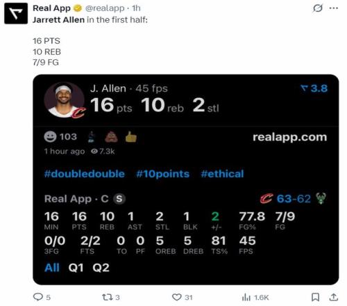 整個上半場雄鹿都沒有限制阿倫的好辦法,上半場阿倫16分鐘,9中7,拿到16分10籃板1助攻2搶斷1蓋帽,命中率高達77.8%。但從下半場雄鹿在籃下開始用兩人卡他,還繞前不給他接球,畢竟騎士只有他一個巨頭。