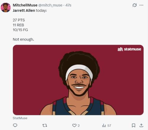 這導(dǎo)致整個下半場阿倫只有1個籃板球進賬,全場比賽32分鐘,15中10,罰球8中7,拿到27分11籃板1助攻2搶斷1蓋帽,命中率66.7%,真實命中率72.9%,正負(fù)值-10。雖然沒有騎士三巨頭阿倫依舊拿到了爆炸的兩雙數(shù)據(jù)。