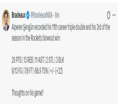休媒曬出申京此役的數(shù)據(jù),盛贊此役他拿到了怪物一般的三雙數(shù)據(jù)。本賽季申京場均6.3助攻實(shí)際是火箭的第一組織進(jìn)攻點(diǎn),他繼續(xù)朝著約基奇的方向進(jìn)發(fā)。